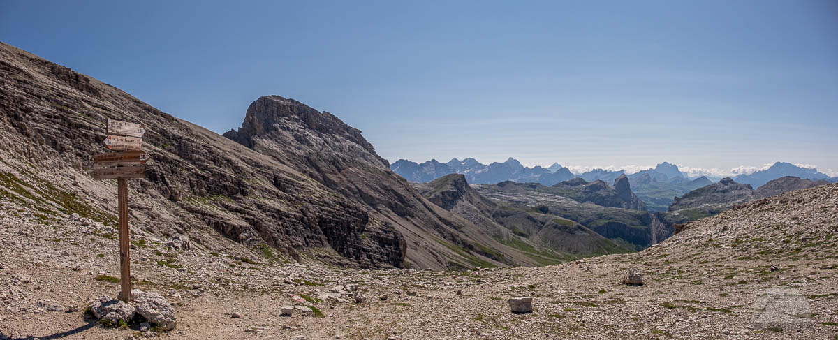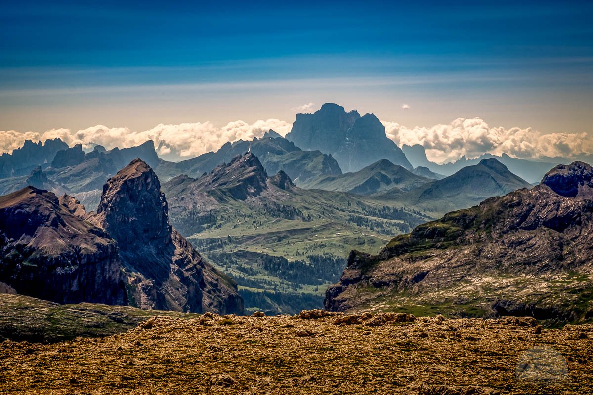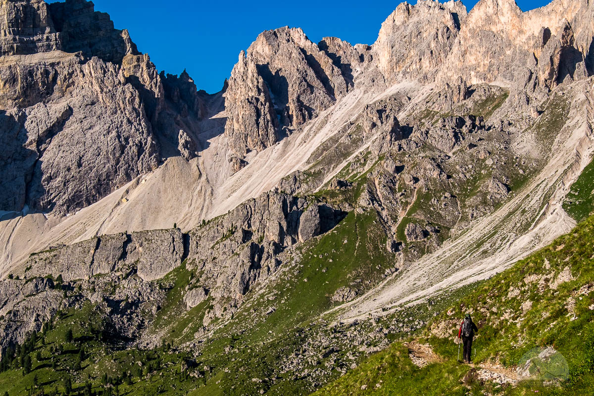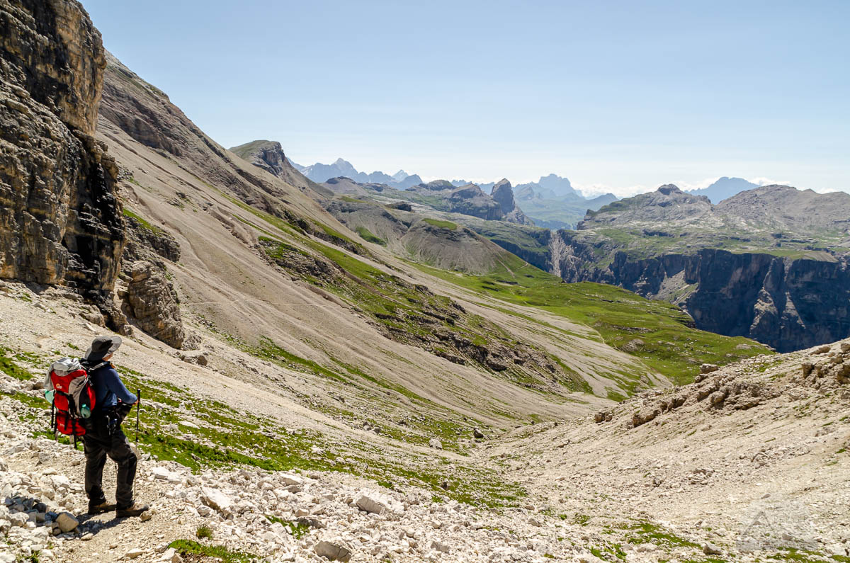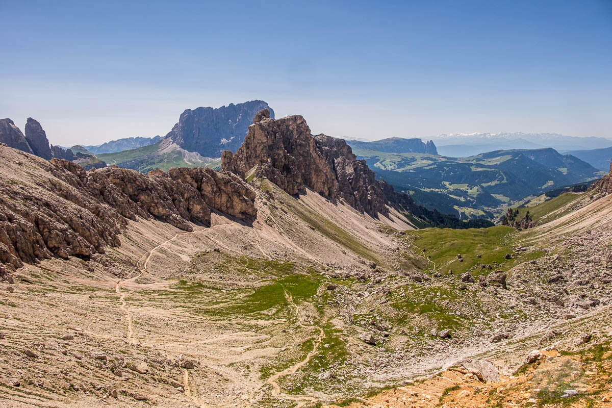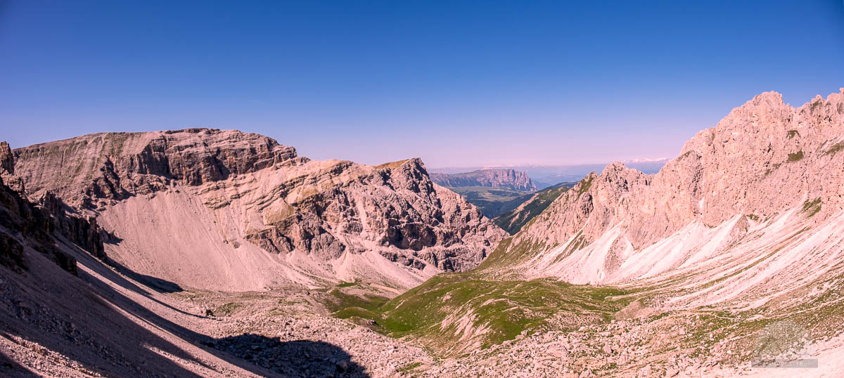 Eine halbe Stunde später ging es dann auf den letzten Teil der Tagesetappe. Über einen schmalen Pfad mit wenig Steigung ging es weiter Richtung Süden und Grödner Joch. Schon wenig später gelangten wir nach der Überquerung des Cir-Jochs in eine abstrakte Felslandschaft. Zwischen den scharfkantigen Felsen marschierend dauerte es nicht lange, bis sich ein atemberaubender Blick auftat.