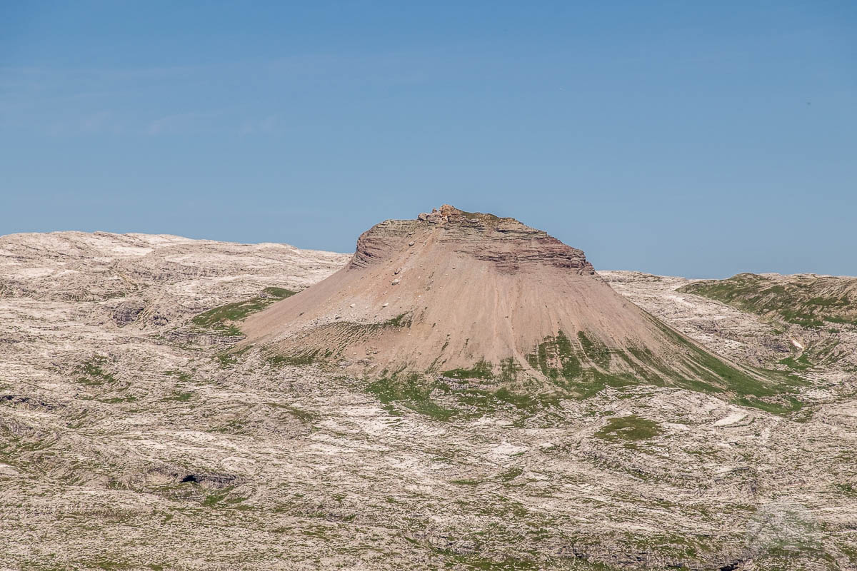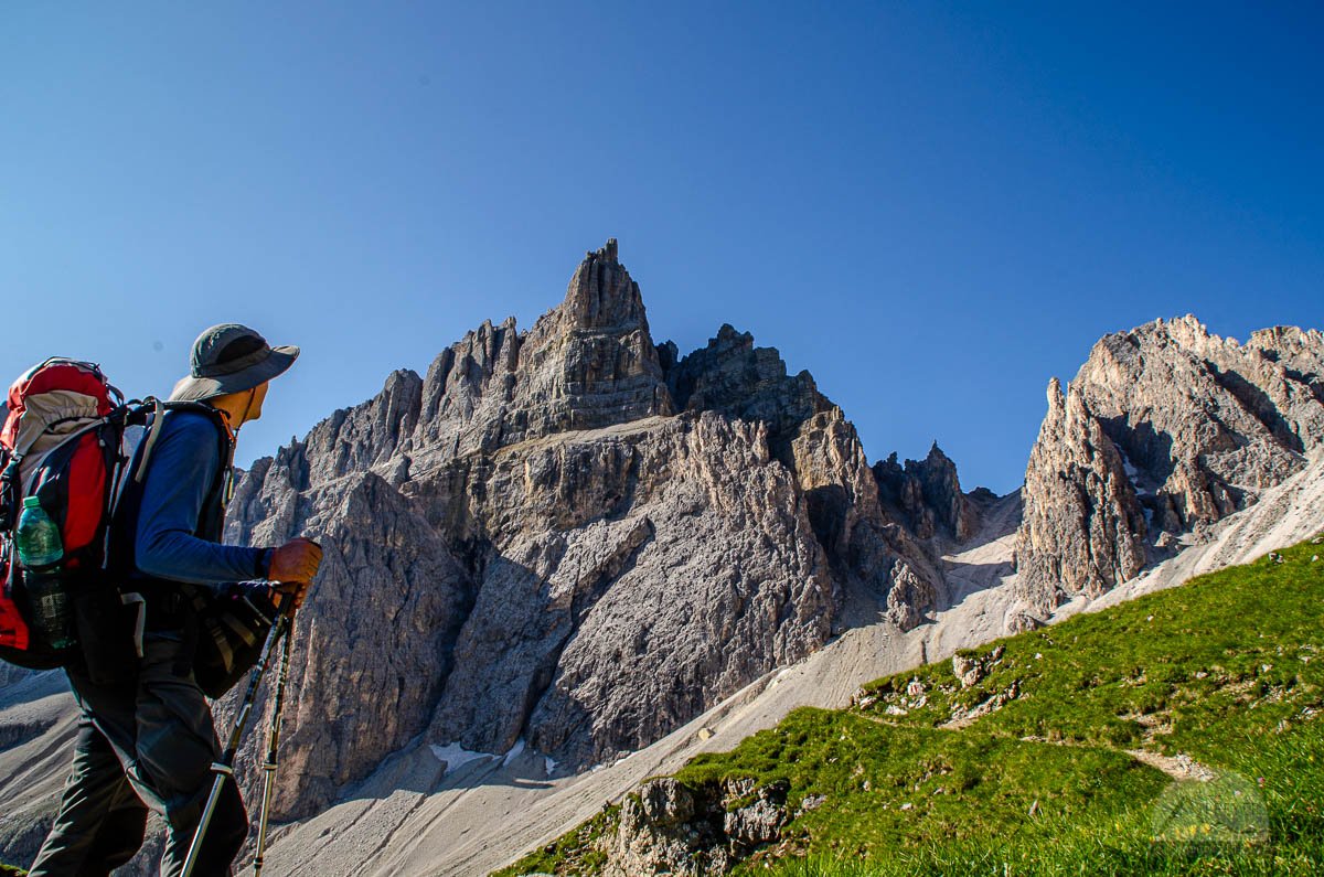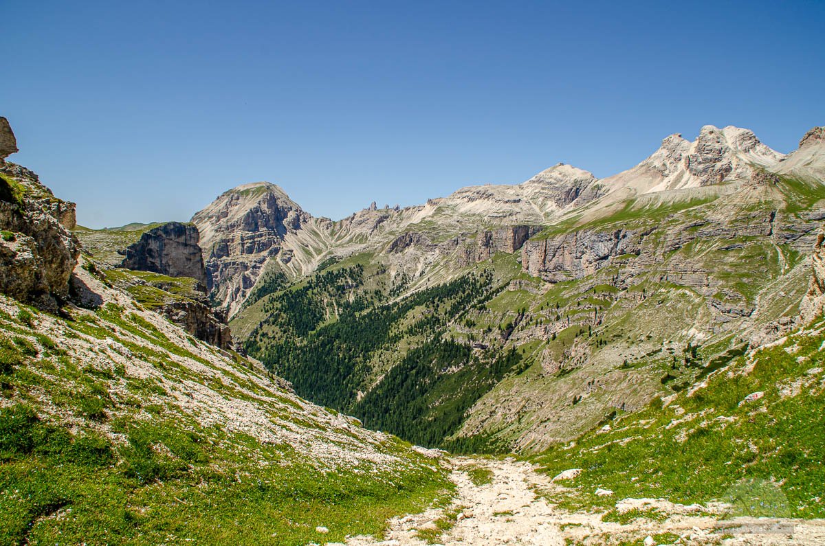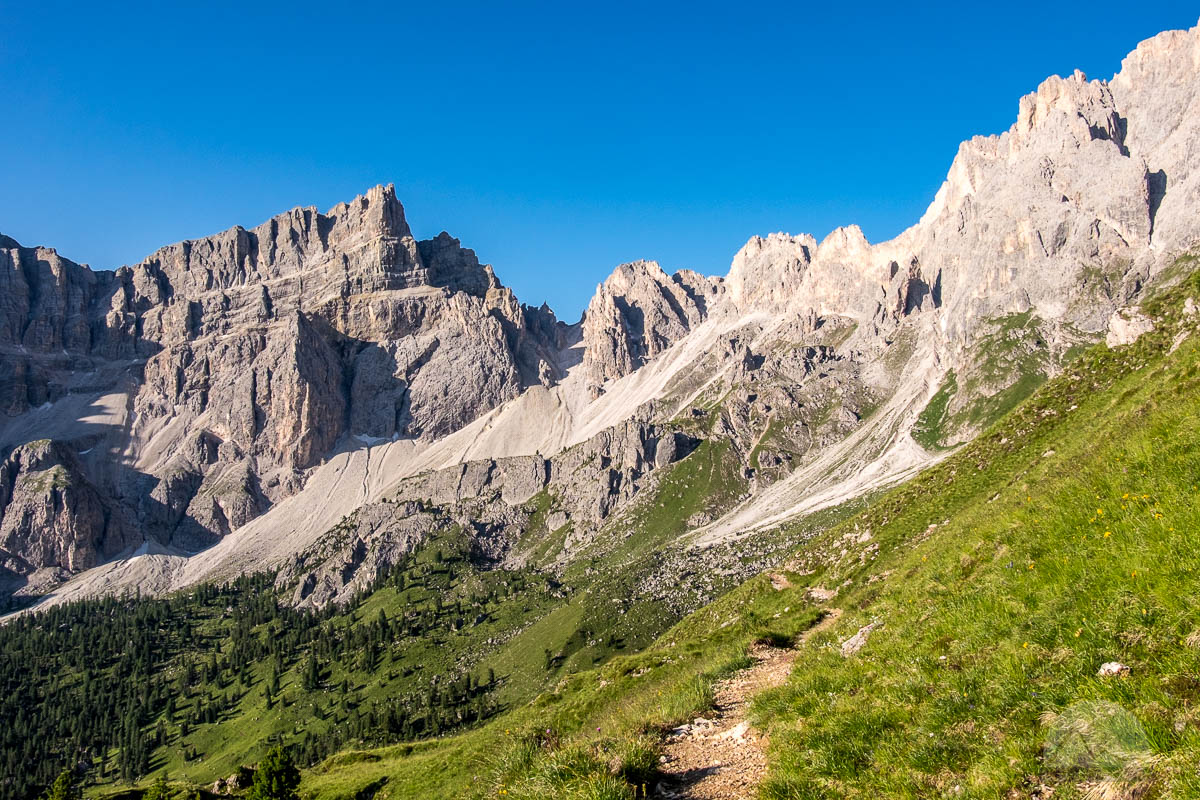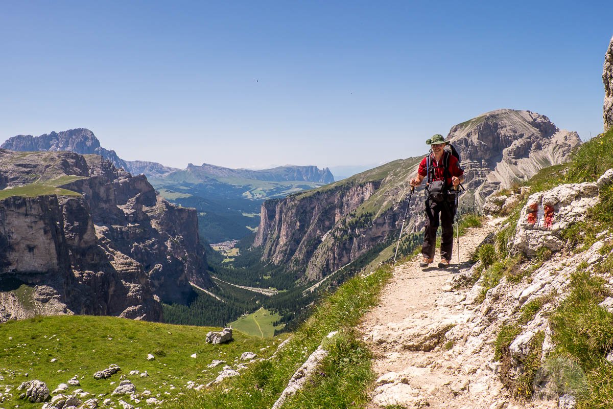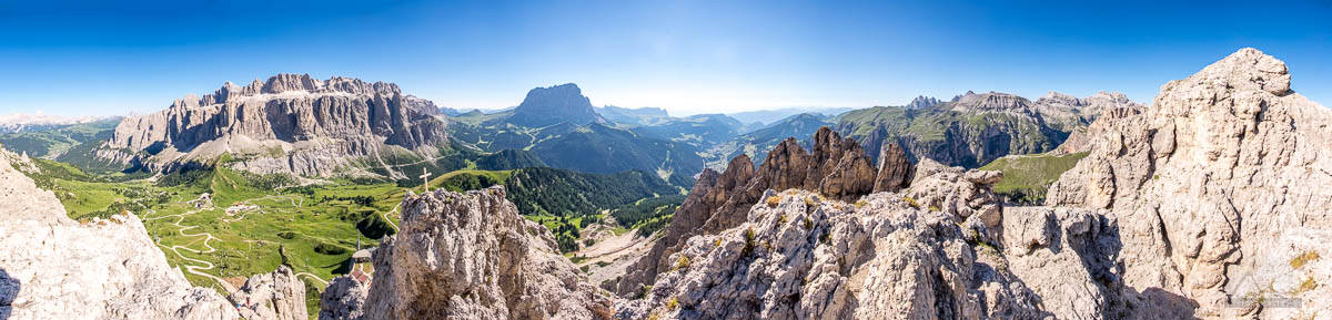 Eine halbe Stunde später ging es dann auf den letzten Teil der Tagesetappe. Über einen schmalen Pfad mit wenig Steigung ging es weiter Richtung Süden und Grödner Joch. Schon wenig später gelangten wir nach der Überquerung des Cir-Jochs in eine abstrakte Felslandschaft. Zwischen den scharfkantigen Felsen marschierend dauerte es nicht lange, bis sich ein atemberaubender Blick auftat.