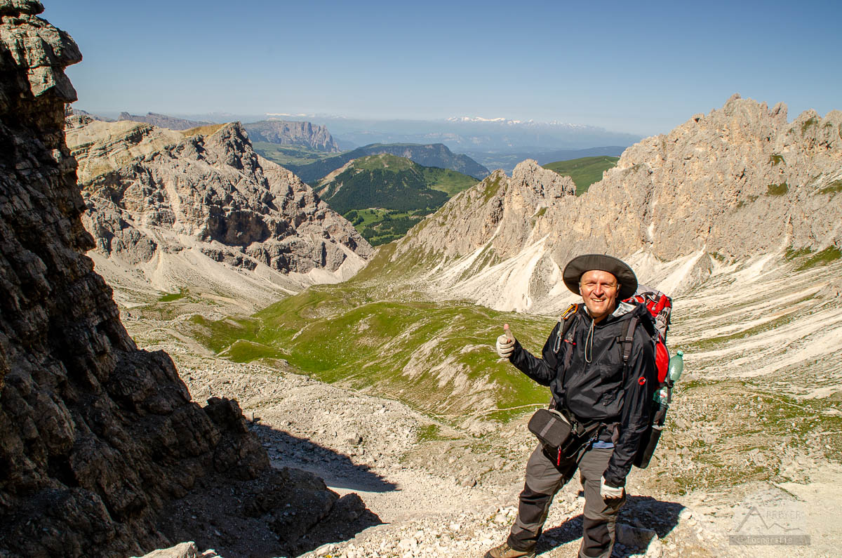Am 16. Tag wichen wir aufgrund einer Empfehlung vom München – Venedig – Tourenbuch ab. Die Etappe endete für uns nicht an der Puez Hütte, sondern ein Stück weiter am Grödner Joch. Eine der landschaftlich beeindruckendsten Etappen erwartete uns und trotz des langen Wandertags bei bestem Wetter gab es am Schluss noch einen Klettersteig als Bonus. Und dann wartete noch ein ganz besonderes Zusammentreffen auf uns.