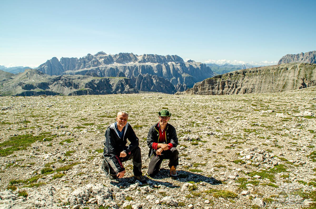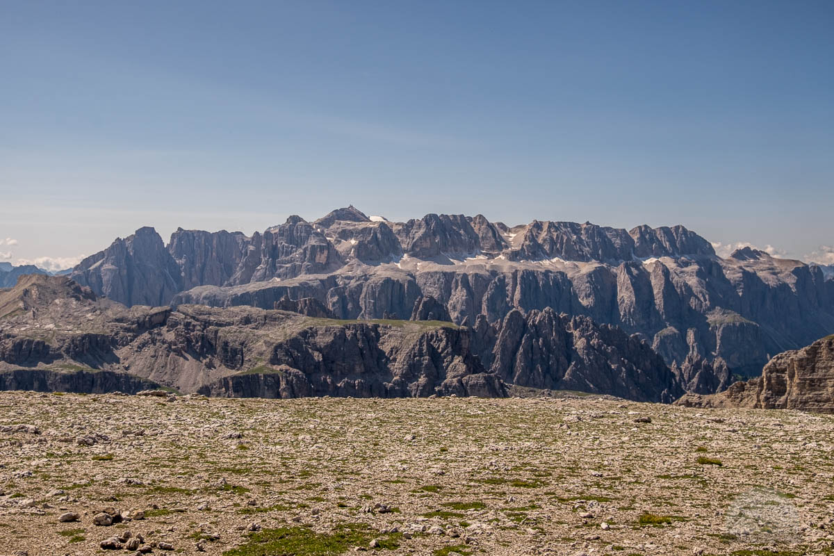Der Ausblick von hier war atemberaubend. Die Scharte selbst war ein großes Plateau mit 270 Grad Blick. Mit absoluter Faszination blickten wir auf die Rosengarten Gruppe und den mächtigen Sella Stock, welchen wir schon am nächsten Tag erklimmen wollten. Dahinter die Civetta Gruppe, an deren Fuße wir zwei Tage später entlanglaufen würden.