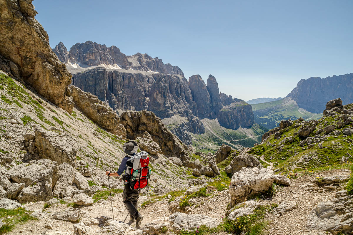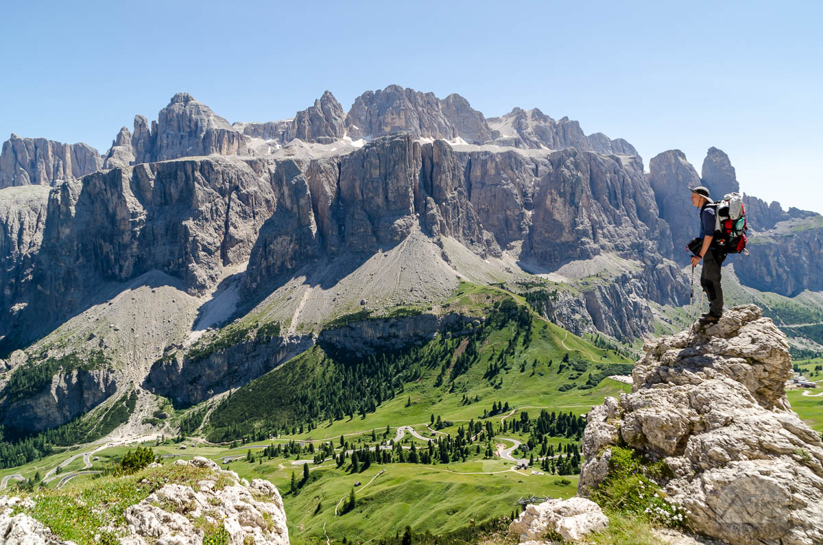 Der Blick aufs Grödner Joch am Fuße des gewaltigen Sella-Stocks. Hier oben wirkte der Lärm der Autos und Motorräder noch so weit weg und wir genossen den Ausblick in Ruhe. Unten am Joch holte uns die Zivilisation mit ihrer lauten Hektik dann leider wieder ein. Während ich den Ausblick genoss ging mir ein Gedanke durch den Kopf: „Diesen großen Felsbrocken werden wir die nächsten ein-einhalb Tage überqueren“. Ein beeindruckender Gedanke.
