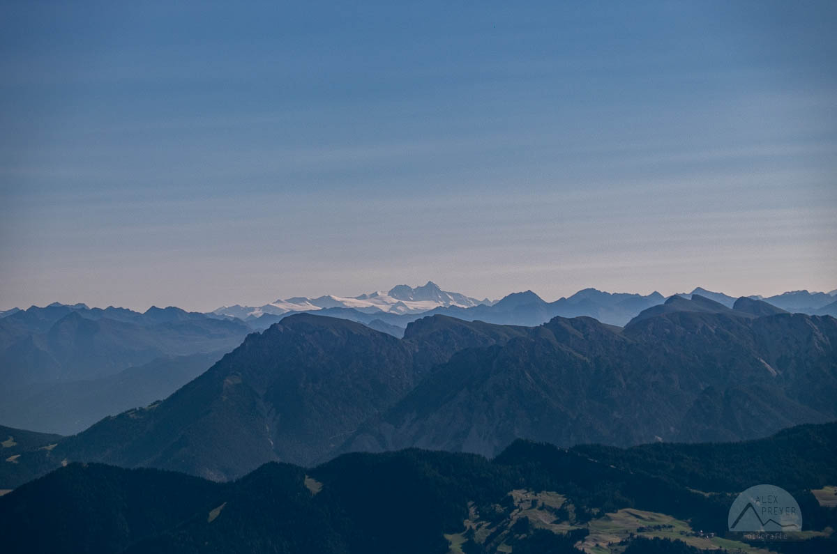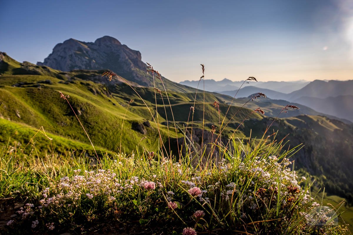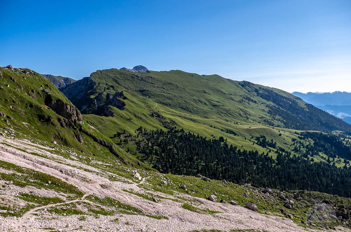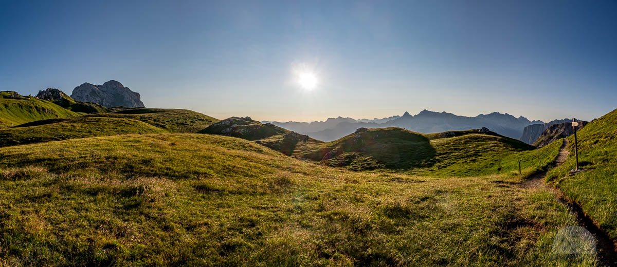 Auch am Tag 16 ging es wieder sehr zeitig ohne Frühstück los. Die Sonne ließ gerade die Berggipfel rot leuchten als wir uns wieder auf den Weg machten. Noch im Schatten liegend ließen wir die Schlüterhütte schnell hinter uns und ging unseren Pfad vom Vortag ein Stück zurück, bevor es dann rechts ab Richtung Grödner Joch ging. Der kleine Pfad schlängelte sich über Almwiesen dahin und schon bald hatten wir wieder den Peitlerkofel im Blick. Dahinter in weiter Ferne leuchteten die schneebedeckten Gipfel der Zillertaler Alpen zu uns herüber. Das Licht- und Schattenspiel auf den grünen Hügeln um uns herum war beeindruckend und veranlasste mich zu vielen Fotos.