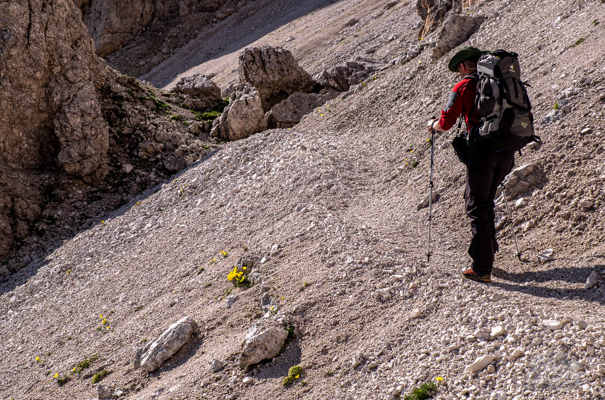 Eigentlich wäre unsere Tagesetappe hier laut Tourenführer zu Ende. Doch aus zwei Gründen wird von vielen das Grödner Joch als Etappenziel empfohlen. Zum einen genoss die Puez Hütte zur Zeit als wir dort waren keinen guten Ruf, zum anderen hatten wir ja noch einen halben Tag Zeit um weiter zu wandern. Nachdem der bisherige Tag auch nicht sehr anstrengend war, bot sich das Weitergehen auch für uns an. So waren wir schon wieder kurz vor ein Uhr auf dem Weg und genossen noch eine ganze Weile den Blick auf das Langental.
