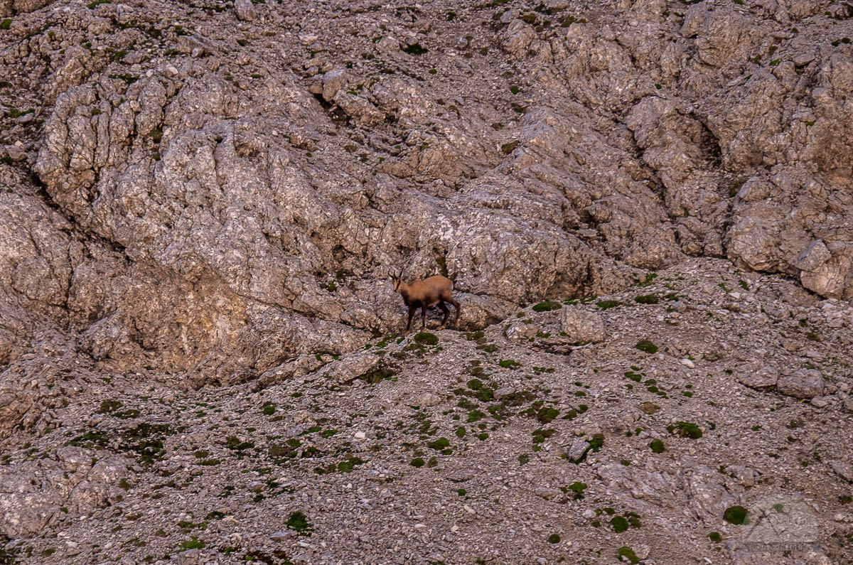 Vom Kreuzjoch aus ging es links weiter. Auf einem kleinen schroffen Pfad, der immer wieder Geröllfelder überquerte, querten wir die Hänge. Hier fanden wir auch in schattigen Plätzen ganze Haufen von dicken Hagelkörnern die wohl 1-2 Tage vor uns hier gefallen sind. Die Größe beeindruckte uns und ich möchte nicht wissen wie es sich anfühlt, von solchen Körnern bombardiert zu werden. Nun begann der Weg langsam anzusteigen, bevor er dann in ein steiles Zick-Zack von Serpentinen überging. Hier sahen wir auch eine der wenigen Gämsen auf unserer Tour. Der Anstieg zur Roa-Scharte stellte sich schließlich als weniger kräftezehrend heraus als gedacht. In unserem Rücken boten sich wieder traumhafte Ausblicke auf den Peitlerkofel und den Alpenhauptkamm.